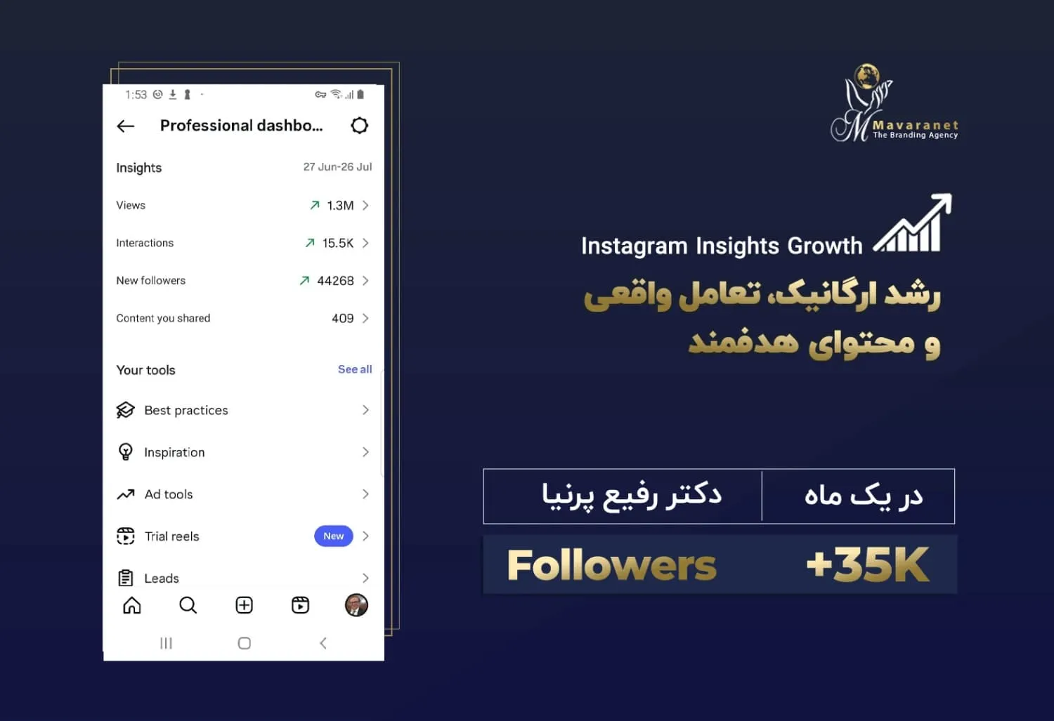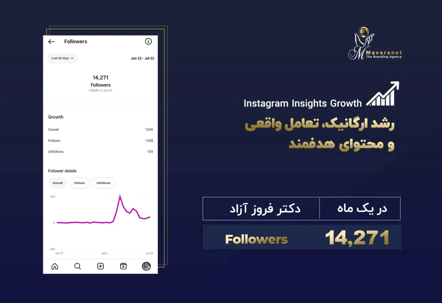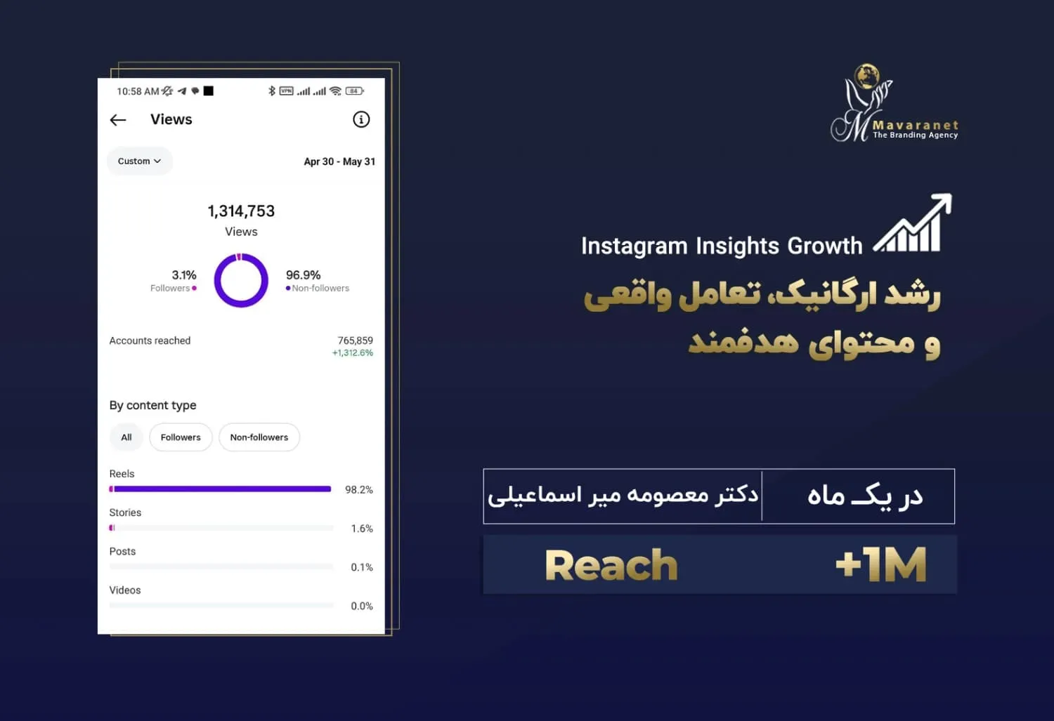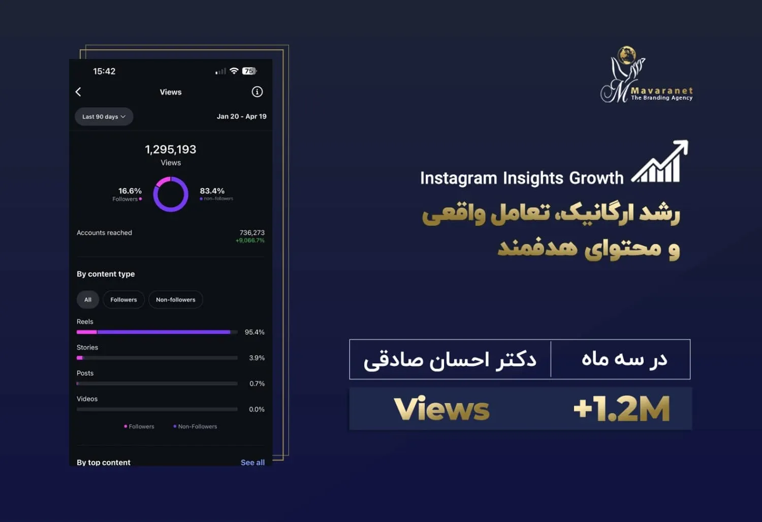 در ادامه می‌توانید برخی از نمونه‌های واقعی از رشد پیج‌های اینستاگرامی را مشاهده کنید که توسط تیم ماورانت مدیریت و بهینه‌سازی شده‌اند. این آمارها بیانگر توانایی ما در تحلیل دقیق رفتار مخاطب، تولید محتوای هدفمند، به‌کارگیری استراتژی‌های به‌روز در اینستاگرام مارکتینگ و اجرای کمپین‌های مؤثر تبلیغاتی هستند. نتایج به‌دست‌آمده، رشد ارگانیک فالوئر، افزایش نرخ تعامل (Engagement Rate) و بهبود برندآگاهی را به‌خوبی نشان می‌دهند.