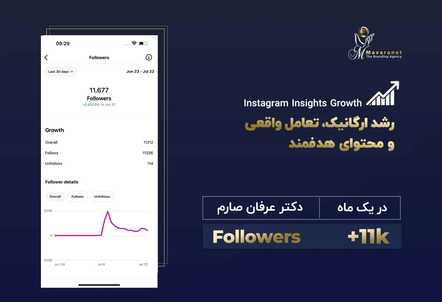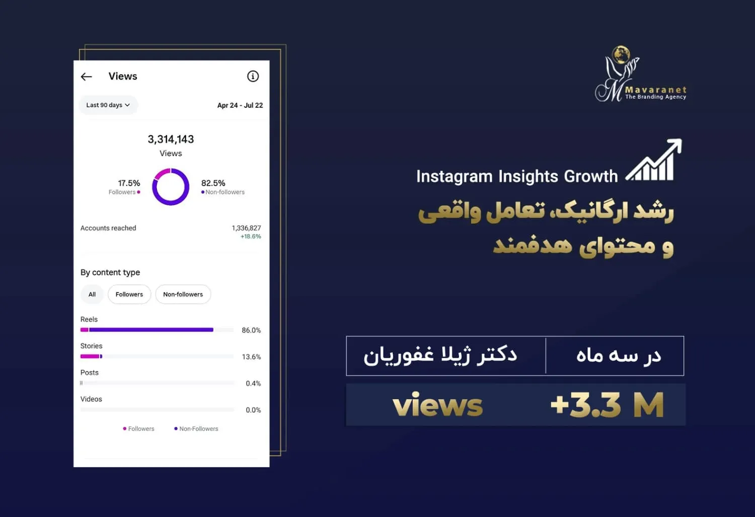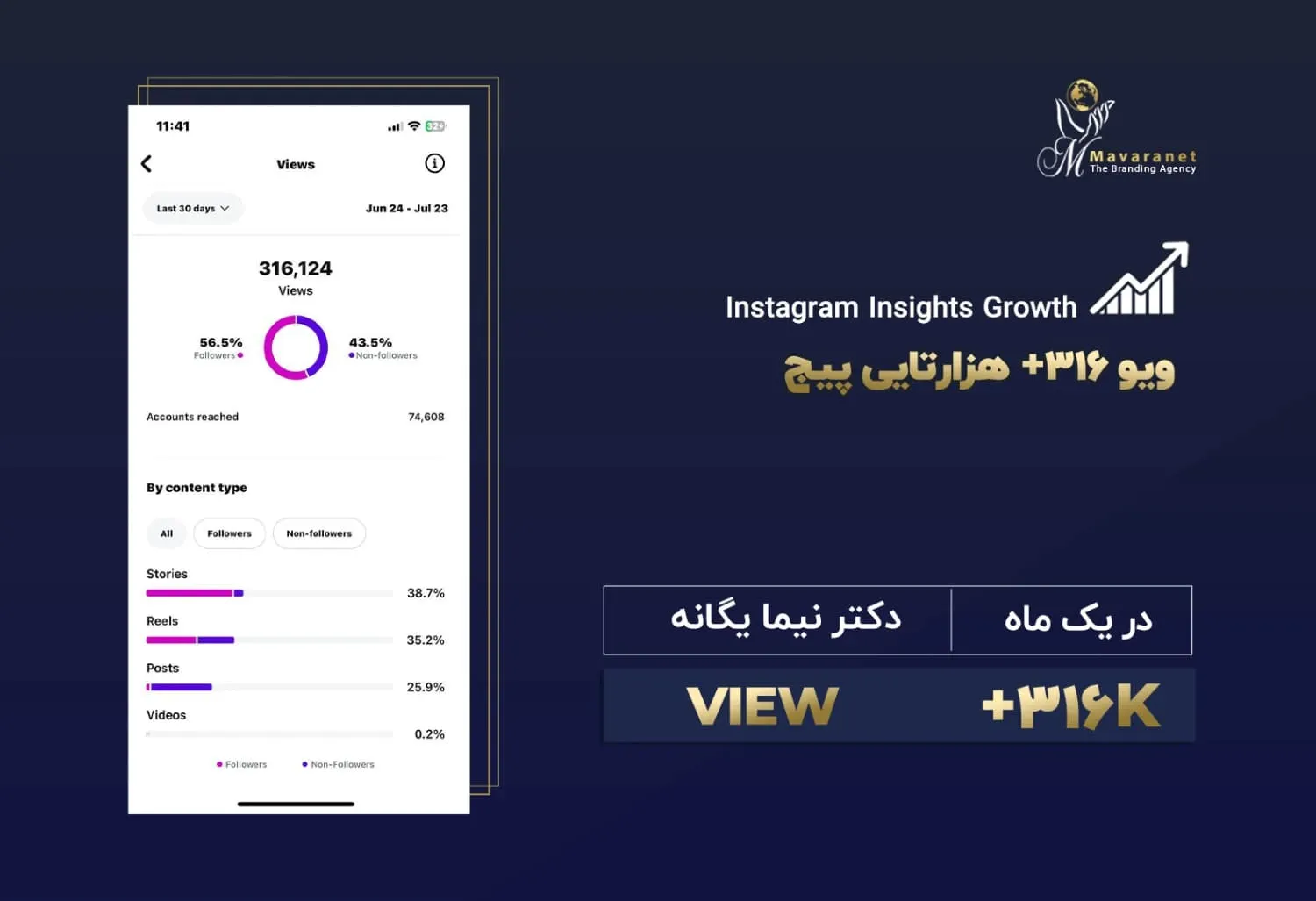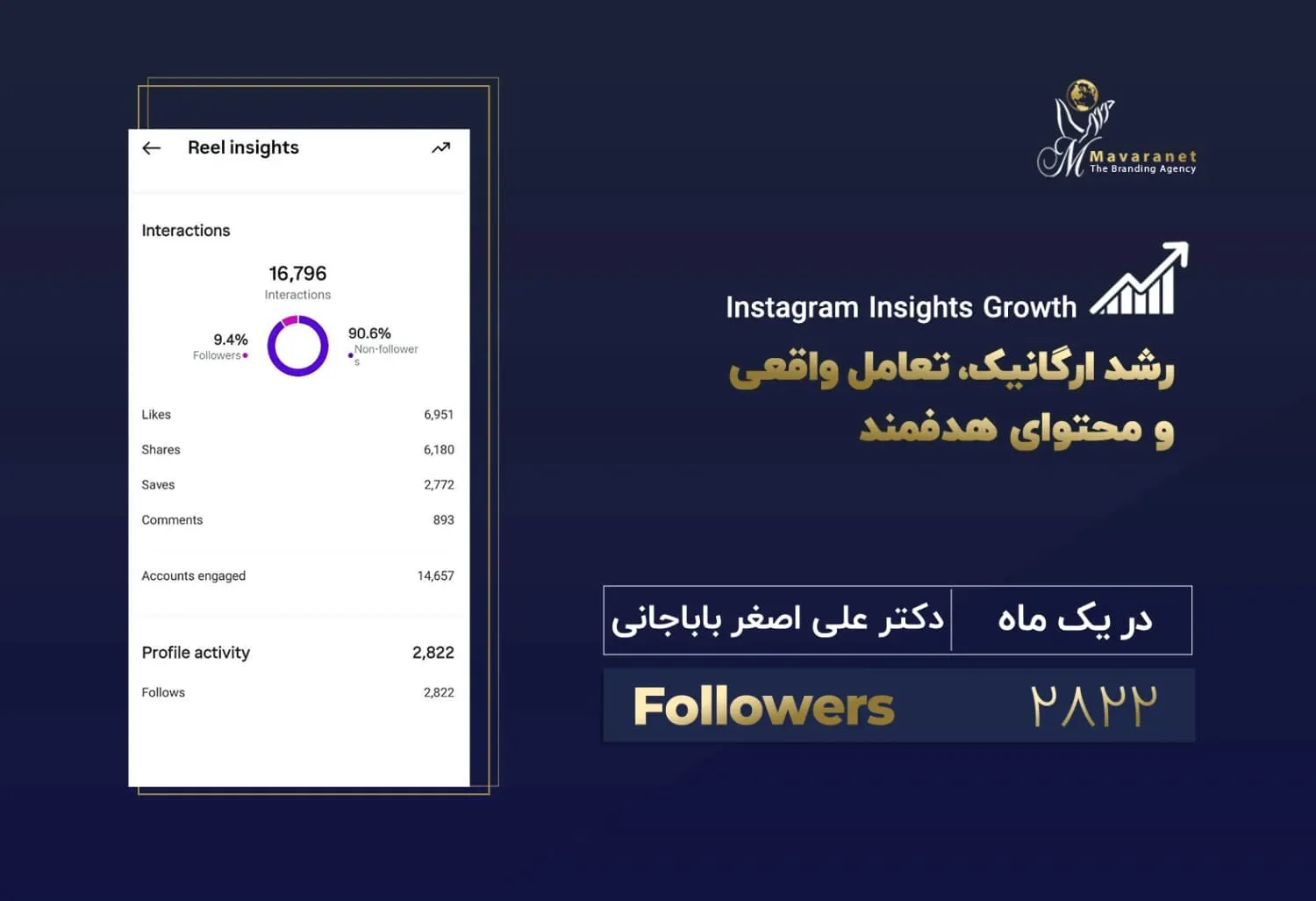 در ادامه می‌توانید برخی از نمونه‌های واقعی از رشد پیج‌های اینستاگرامی را مشاهده کنید که توسط تیم ماورانت مدیریت و بهینه‌سازی شده‌اند. این آمارها بیانگر توانایی ما در تحلیل دقیق رفتار مخاطب، تولید محتوای هدفمند، به‌کارگیری استراتژی‌های به‌روز در اینستاگرام مارکتینگ و اجرای کمپین‌های مؤثر تبلیغاتی هستند. نتایج به‌دست‌آمده، رشد ارگانیک فالوئر، افزایش نرخ تعامل (Engagement Rate) و بهبود برندآگاهی را به‌خوبی نشان می‌دهند.