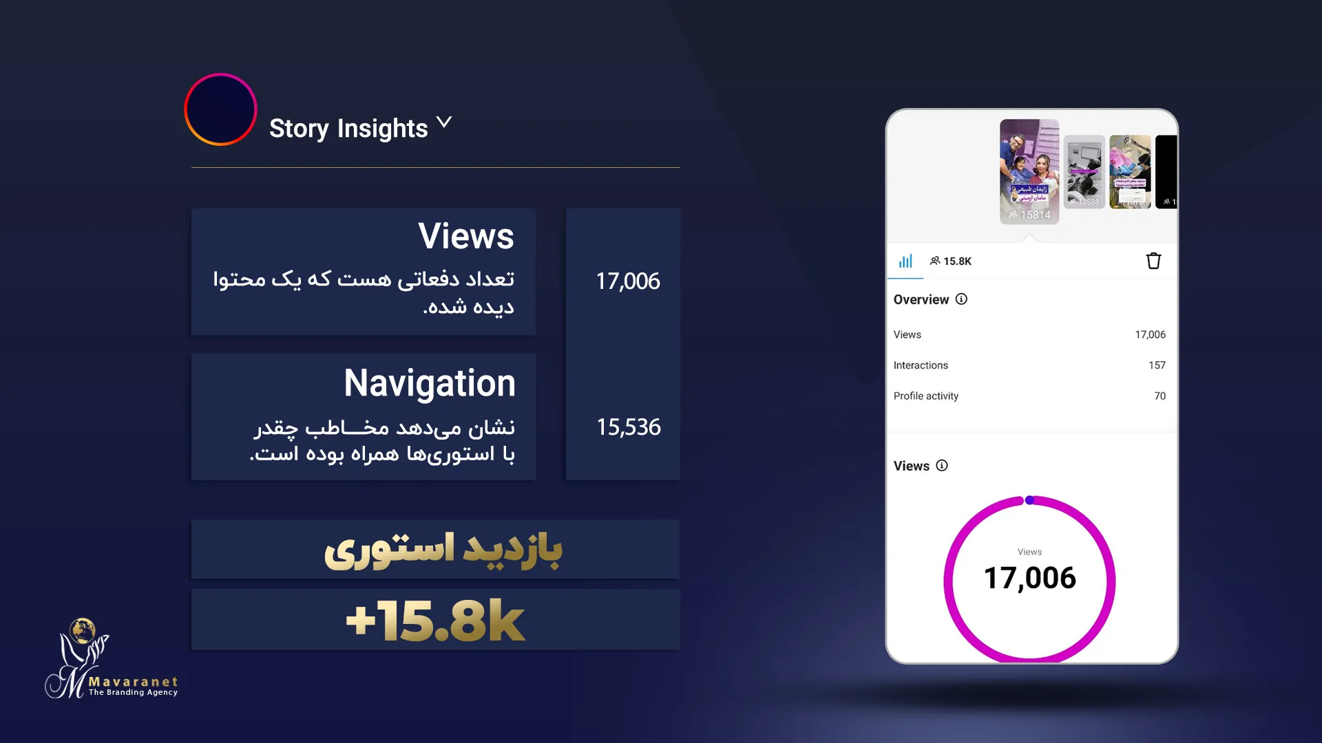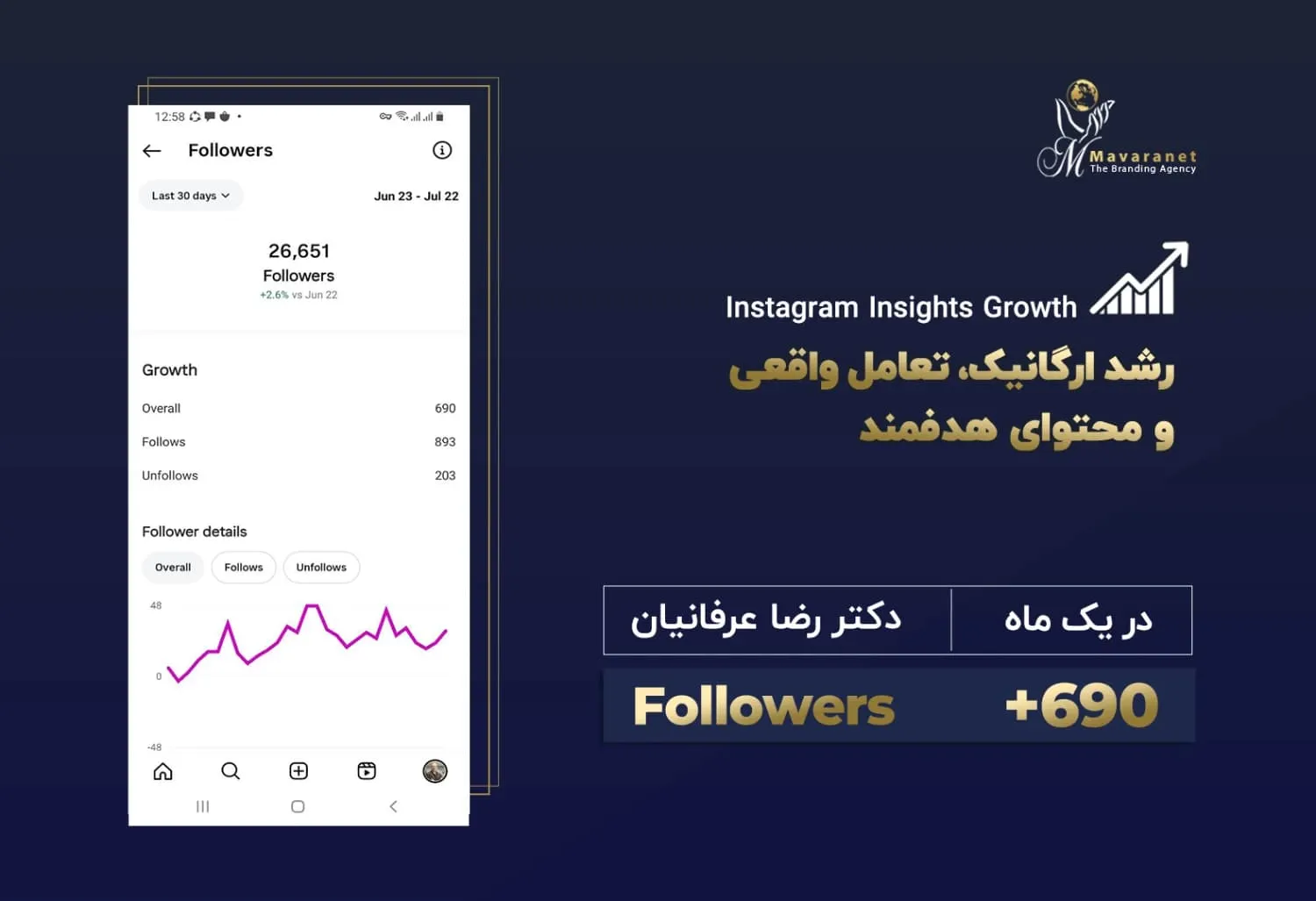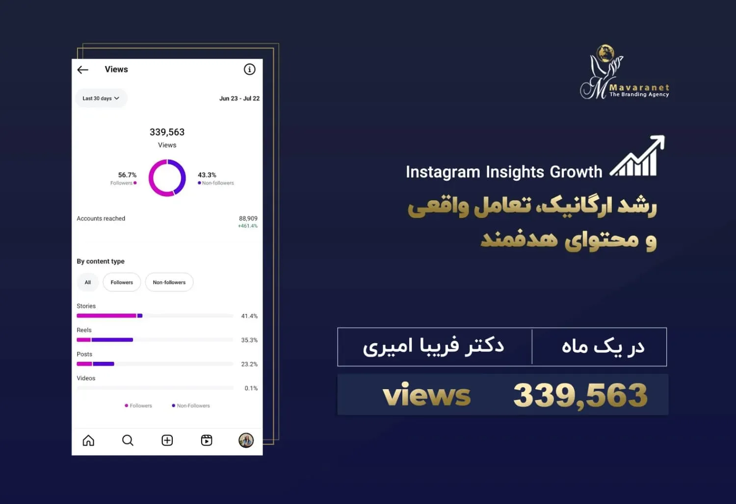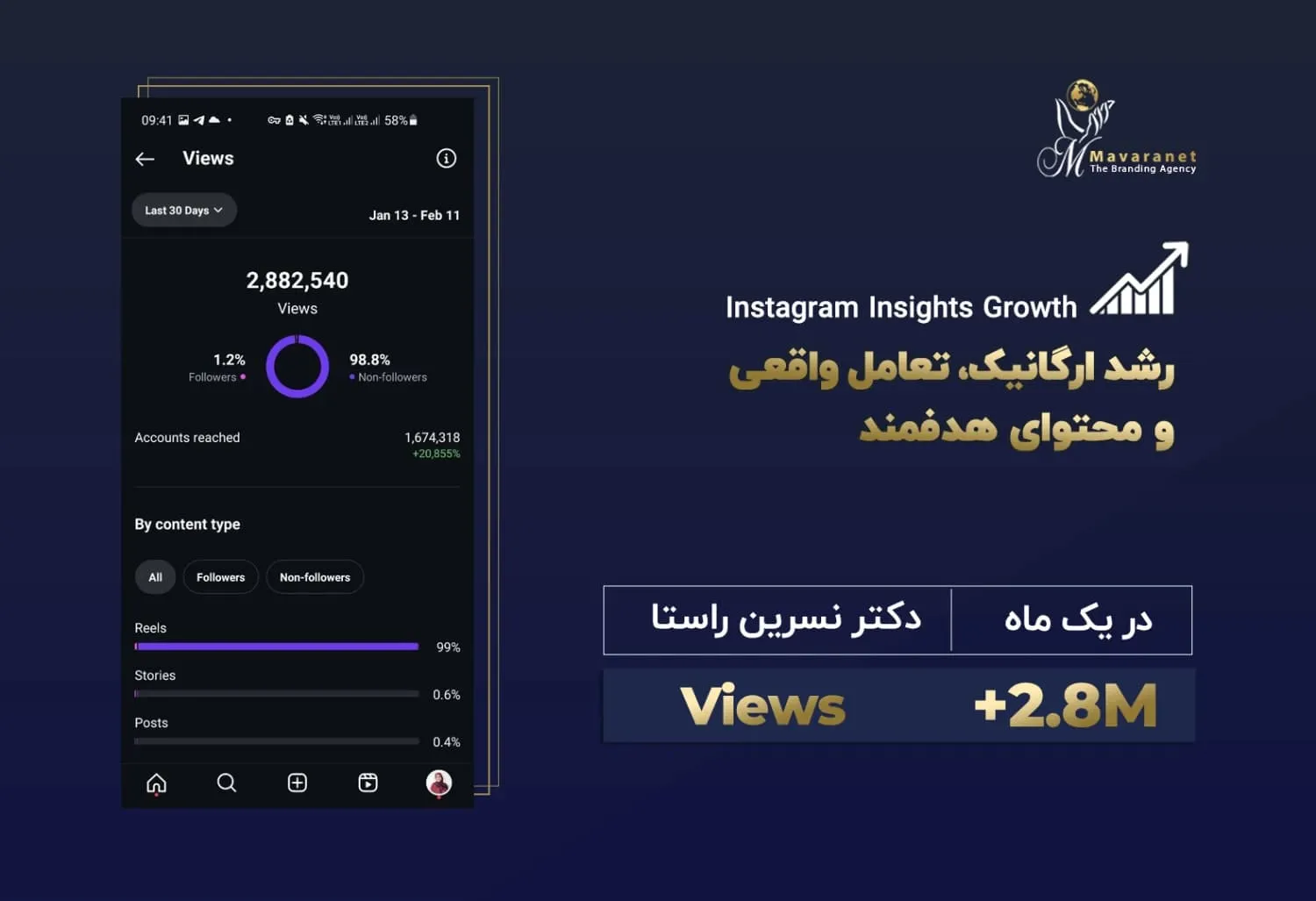 در ادامه می‌توانید برخی از نمونه‌های واقعی از رشد پیج‌های اینستاگرامی را مشاهده کنید که توسط تیم ماورانت مدیریت و بهینه‌سازی شده‌اند. این آمارها بیانگر توانایی ما در تحلیل دقیق رفتار مخاطب، تولید محتوای هدفمند، به‌کارگیری استراتژی‌های به‌روز در اینستاگرام مارکتینگ و اجرای کمپین‌های مؤثر تبلیغاتی هستند. نتایج به‌دست‌آمده، رشد ارگانیک فالوئر، افزایش نرخ تعامل (Engagement Rate) و بهبود برندآگاهی را به‌خوبی نشان می‌دهند.